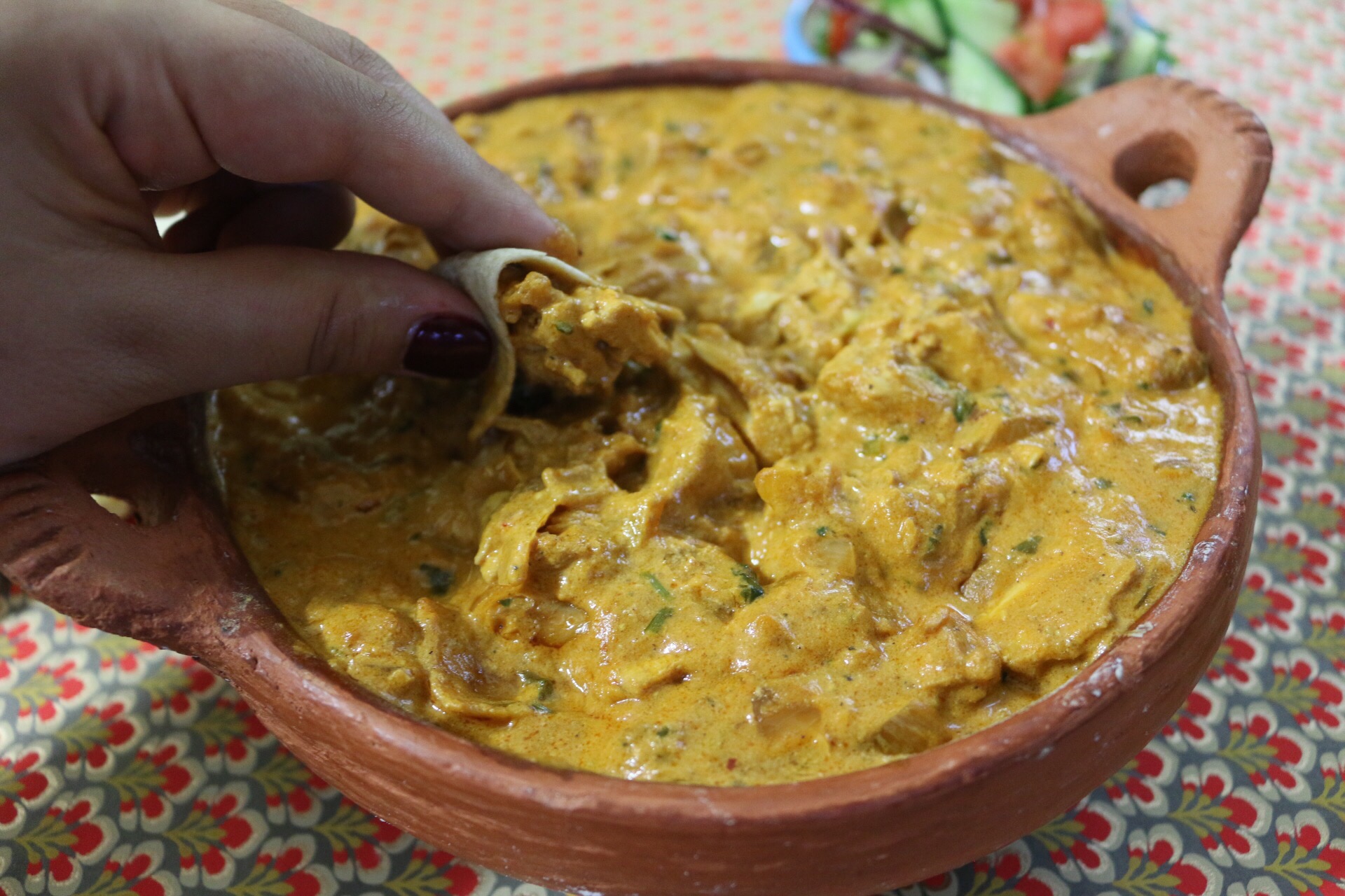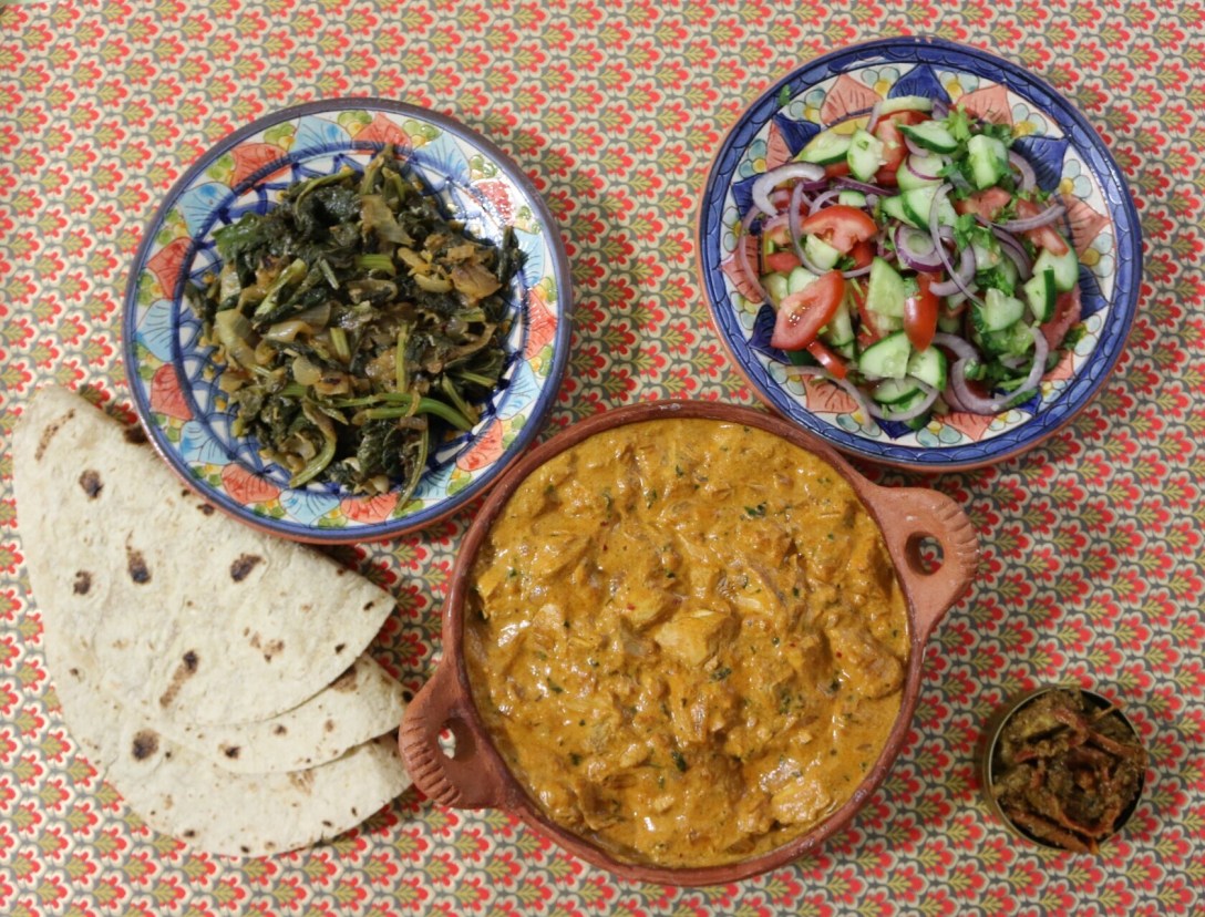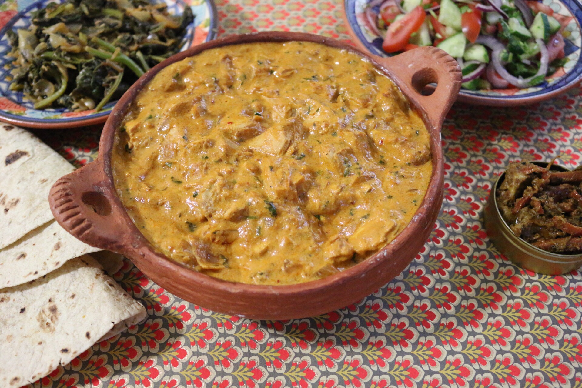 butter chicken is a punjabi dish and it’s definitely one of my favorites. there are many methods to preparing this goodness, i generally like to eat this dish boneless, but feel free to use any cut of chicken you like! it’s a regular in my home now. we usually serve it with salad, rice, roti and achar. this time i also sautéed mustard greens. the bitterness contrasts nicely with the creamy butter chicken.
