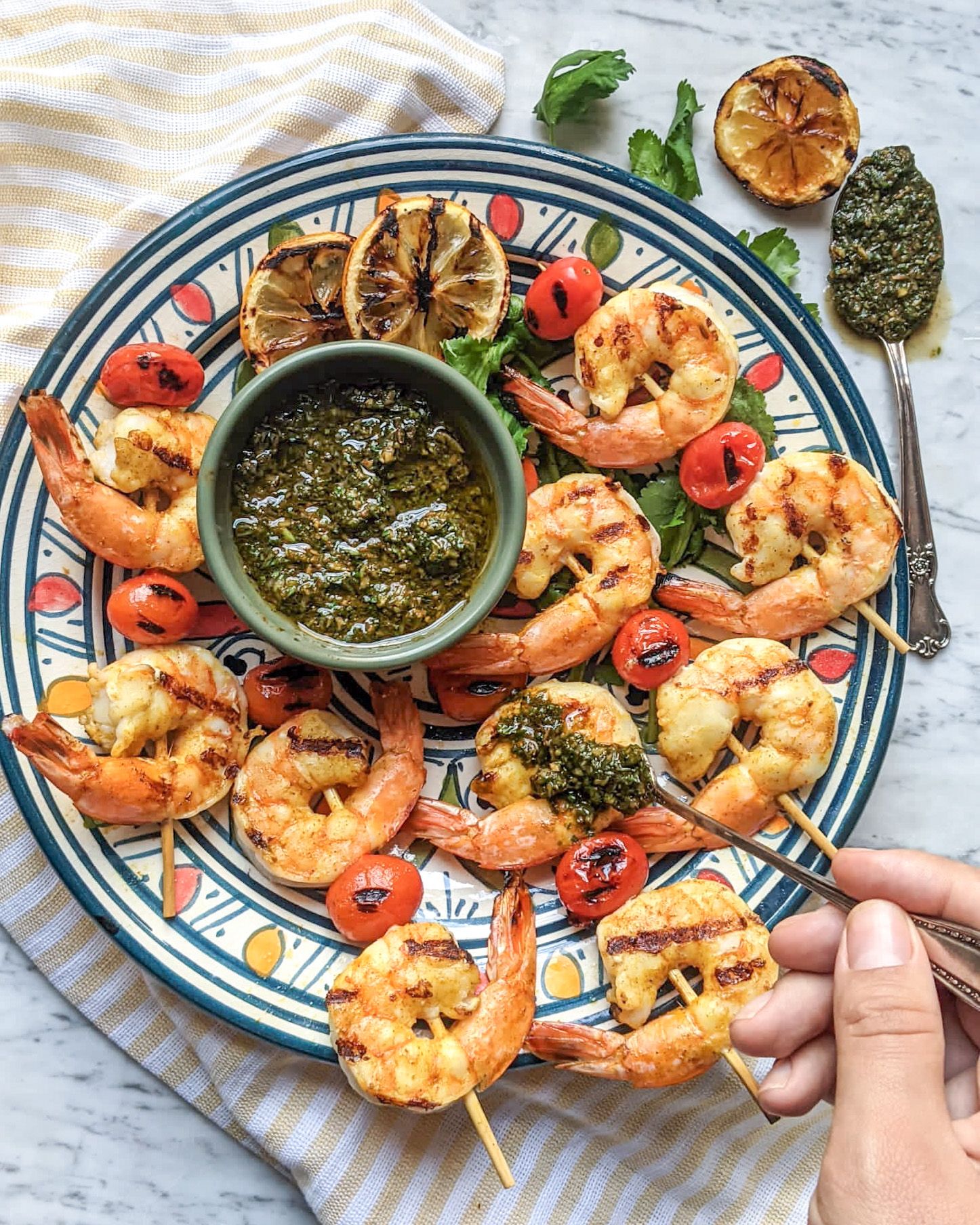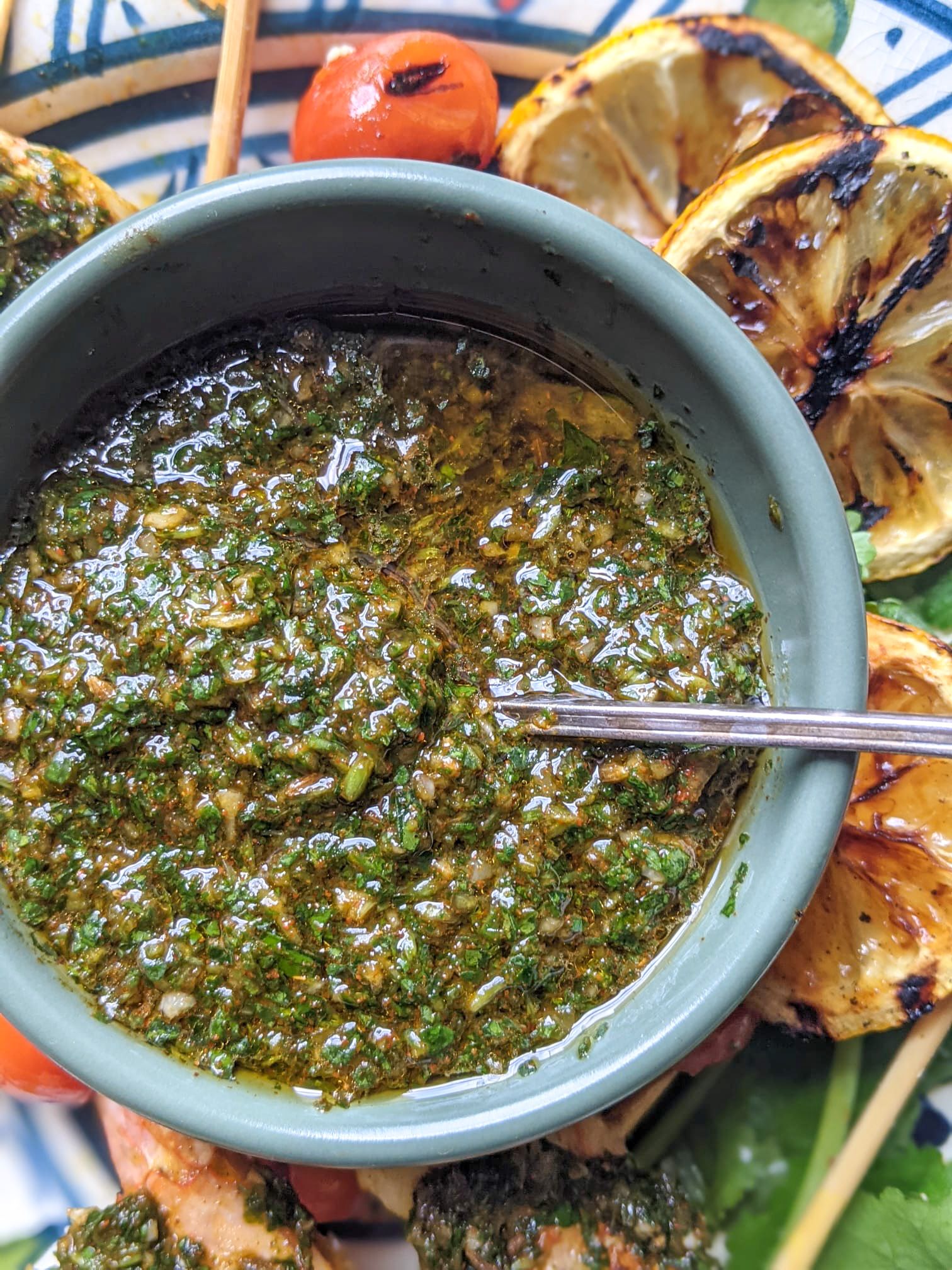 i love pairing my grilled meats, seafoods and veggies with sauces and dips and this chermoula is perfect. it’s a north african herby sauce, similar to chimichuri, that’s used as a condiment and/or marinade.