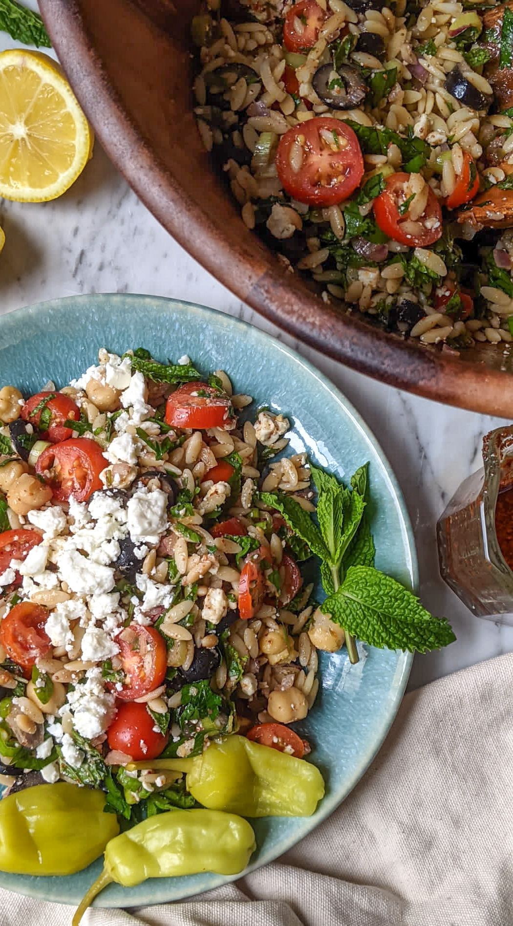 🍴add herbs and vegetables to orzo, drizzle with the dressing and toss to combine.